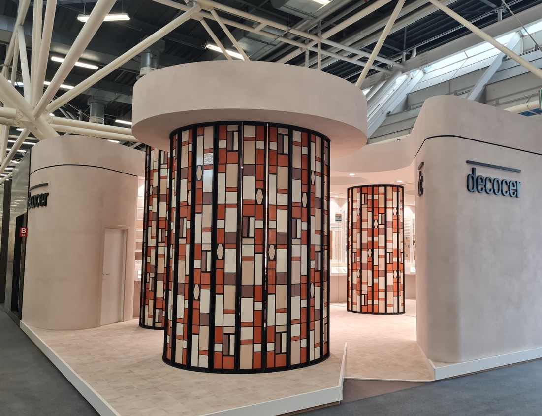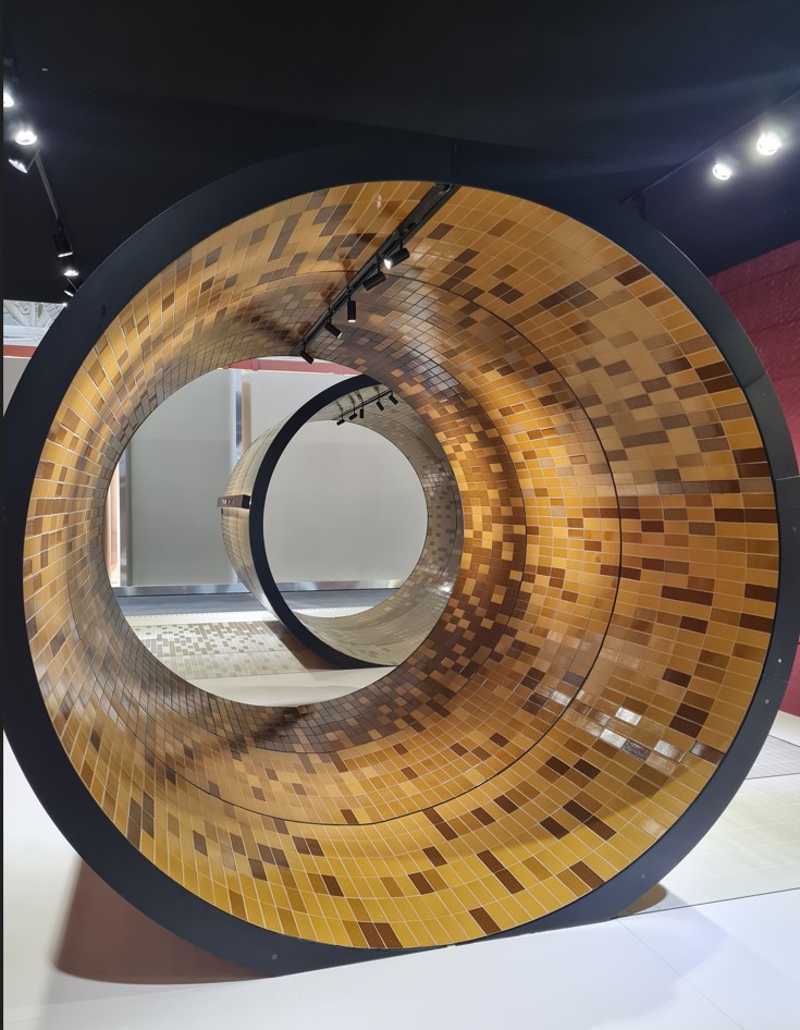 Capitolo allestimenti: Ceramica Sant’Agostino ha sempre un vastissimo spazio espositivo molto ben fatto, wow design propone elementi cilindrici per mettere in evidenza la possibilità di utilizzare i piccoli formati per rivestire pareti tonde, volumi cilindrici anche per decocer, tanti bolli colorati invece per Tonalite.