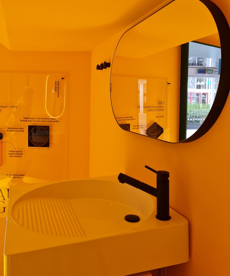 Novità in casa Art Ceram col prototipo di lavatoio Oblò da posizionare sopra le lavatrici slim.