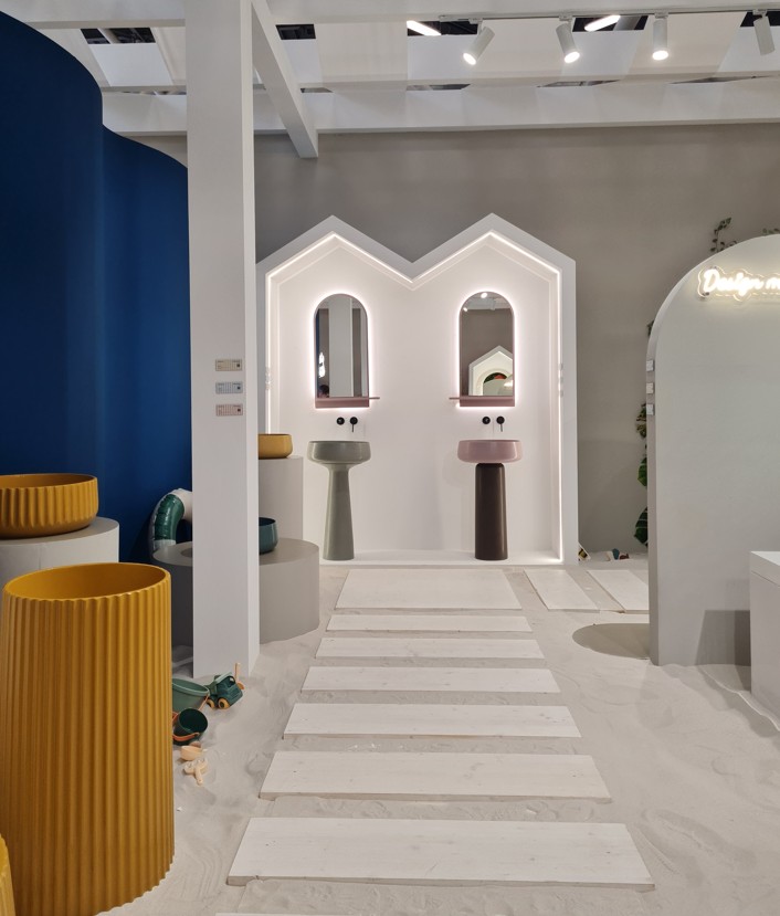Relax design ci trasporta in una tipica estate italiana con i suoi lavabi posizionati sulla sabbia con cabine balneari a fare da sfondo e tavole da surf invece che piatti doccia.