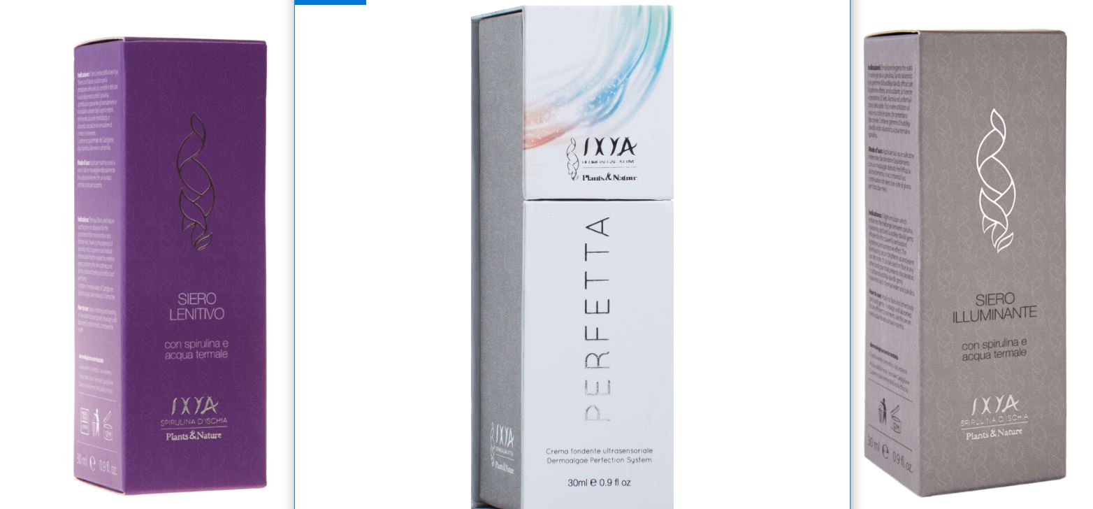 Perfetta è la crema vellutata dall’effetto rivitalizzante e perfezionante per viso, collo e décolleté con l’innovativo dermoalgae perfection system, il sistema sviluppato in esclusiva da IXYA che: stimola la produzione di collagene dall’interno, biorivitalizza i tessuti e favorisce un effetto levigante a lungo termine grazie alla sinergia tra l’effetto delle microalghe Chlorella, Spirulina e Astaxantina, l’acqua ipertermale di Ischia ed un esclusivo complesso di acido jaluronico. La crema Perfetta illumina il viso e regala un effetto filler rimpolpante, donando una piacevole sensazione di comfort con la sua texture fondente e impalpabile.
