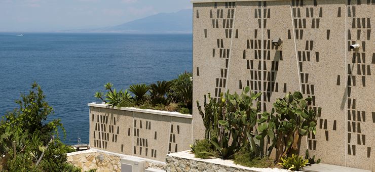 La finitura architettonica del complesso si compone di vari elementi geometrici, ottenuti a partire da un’astrazione formale trapezoidale di base, che creano nell’insieme composizioni variabili e vibranti. Le cromie tipiche del paesaggio caprese vengono riproposte nelle facciate dell’edificio, quasi a renderlo una ulteriore declinazione del naturale. Il carattere industriale dell’architettura si esprime nella forte qualità dei materiali e dei dettagli, arricchiti con particolari di finitura e montaggio. Tenendo conto delle condizioni ambientali particolarmente aggressive (salsedine, umidità, raggi ultravioletti, …) sono state definite soluzioni in grado di azzerare le manutenzioni.