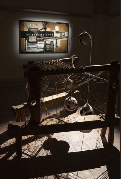 Ceramiche e objets trouvés per realizzare colonne dedicate a dee immaginarie, quadri che raccolgono visioni, immagini, disegni e segni per rappresentare il disorientamento. E poi piante, fiori, vasi e ancora una serie di teste abnormi “Rattoppi e addobbi” a forma di sasso ma vestite, ricamate, rattoppate, avvolte, intarsiate di tessuti e incrostazioni preziose e non pendono dall’alto per affollare il villaggio di ricamatrici seriali dove quello che conta è il ricamare ognuno a conto suo su qualsiasi materiale