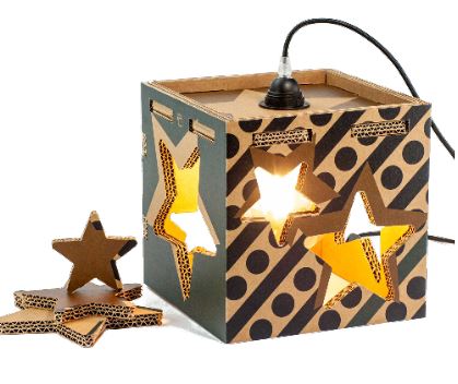 LAMPADA STARS Lampada da tavolo in cartone riciclato e riciclabile con decori stelle che possono essere staccati ed utilizzati come decori.
