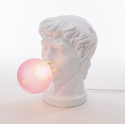 Le forme della lampada Wonder richiamano l’estetica delle statue classiche, parte di un immaginario collettivo condiviso: una testa maschile plasmata completamente in resina riproduce fedelmente le fattezze dei modelli dell’arte classica, creando un cortocircuito visivo e tattile tra l’effettivo materiale impiegato e il marmo. L’uomo viene immortalato in una posa inusuale e contemporanea, quella di realizzare un palloncino con un chewing gum: nell’azione di soffiare l’uomo aggrotta la fronte e incrocia gli occhi, come a chiedersi quale possa essere lo scopo di questo gesto ludico, in bilico tra il passatempo e la noia.