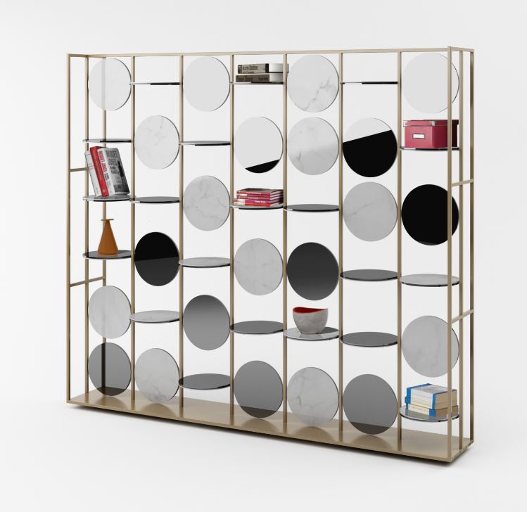 La libreria si compone di elementi piani fissi e altri dinamici che permettono ogni volta diverse composizioni all’interno della libreria coniugando materiali diversi e spesso in contrasto fra loro.