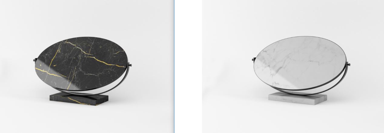 Il semplice movimento di rotazione del tavolo lungo il proprio asse costruttivo permette di avere un piano di appoggio, oppure una specchiera d’arredo. Un piano opaco ed il suo opposto in specchio conferisce dinamicità ad un solo oggetto che solo apparentemente può sembrare statico.