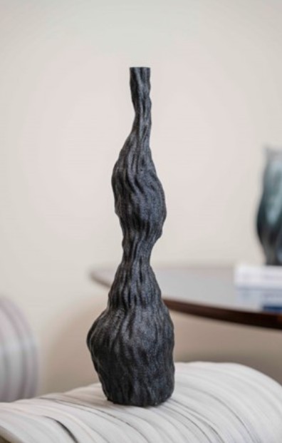 Vaso Simula, realizzato attraverso stampa 3D in bioplastica PLA. Questo vaso dal colore nero, profondo e materico, modellato attraverso la scultura digitale, presenta una bocca strettissima che permette di accogliere un solo fiore, bellezza solitaria. Un messaggio che porta con sé il senso dell’attenzione, della minuziosa selezione e dell’elogio della solitudine come momento di riflessione, equilibrio e contemplazione.