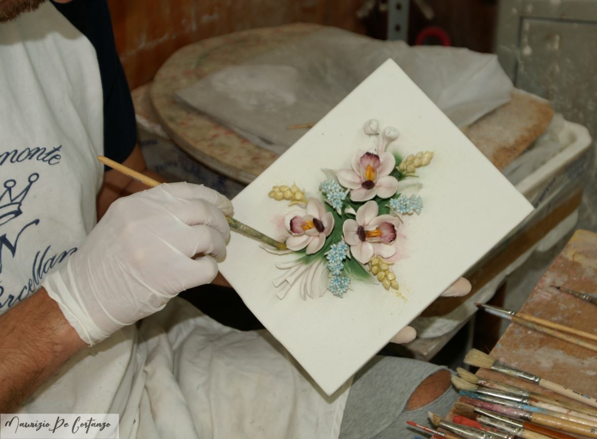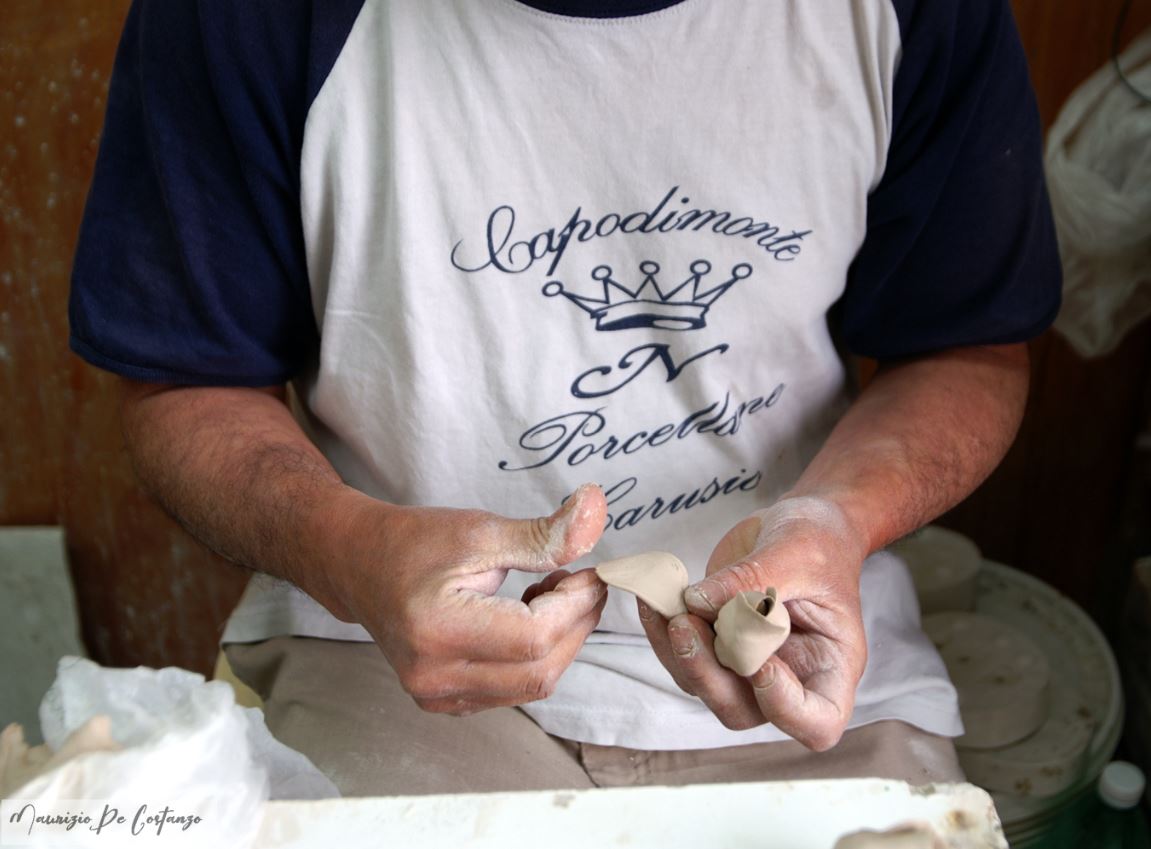 Si chiama porcellana perché è un materiale diverso da terraglia che è ceramica. La porcellana è il materiale più pregiato. Quello che ci contraddistingue molto è ovviamente il fatto a mano della foggiatura dei fiori, unico nel panorama mondiale. Anche la statuaria è diversa dalle altre, diamo un’idea veritiera dei personaggi, dinamica, infatti i nostri soggetti sono sempre impegnati in azioni mentre avvengono. Ci paragonano a Filippo Tagliolini capo modellatore della fabbrica di Ferdinando IV quando imperava il classico, come Canova. Infatti lui si modellava su quello stile, imitava quelle statue.