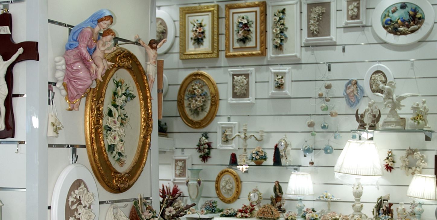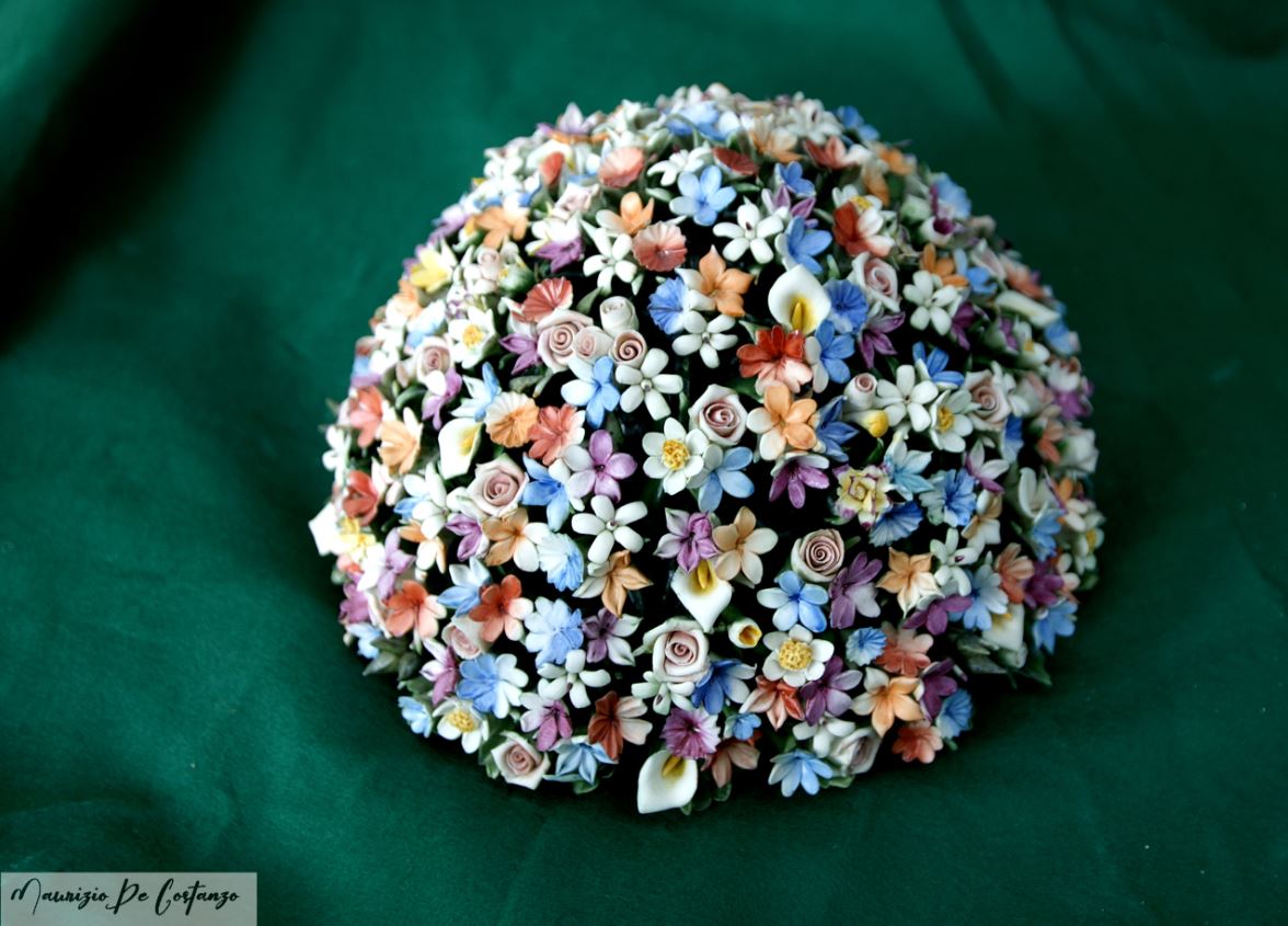 Porcellane. La produzione va dalle composizioni floreali per oggettistica e bomboniere a pendenti, orecchini e spille fino all’arte presepiale e arte sacra con anche soggetti mitologici. Abbiamo poi le statuine tra cui Pulcinella, la maschera tipica napoletana con varianti a tema. Lo vedi con la pizza, spaghetti, caffè. E poi i complementi d’arredo: lampadari, lampade e applique, specchiere e quadri.
