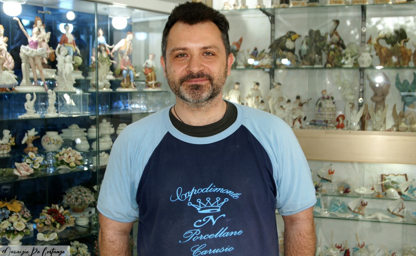 LA DITTA – Dal 1999 Giovanni Carusio è l’espressione dell’esperienza e della tradizione di ben quattro generazioni di ceramisti napoletani, figlio di Giuseppe che per 50 anni lavorà con le allora gloriose fabbriche in loco: Freda, Stile, De Palma, Majello e Mollica nelle quali acquisì varie specializzazioni tra cui modellista, formatore, ritoccatore e fornaciante. Giovanni ci riceve nel suo laboratorio negozio a pochi minuti dalla reggia di Capodimonte, a via Ponti Rossi, nell’ultima fabbrica rimasta su strada con annessa vendita e ci racconta di come si specializzò nella pittura e di come ha gestito il passaggio di business da padre a figlio.