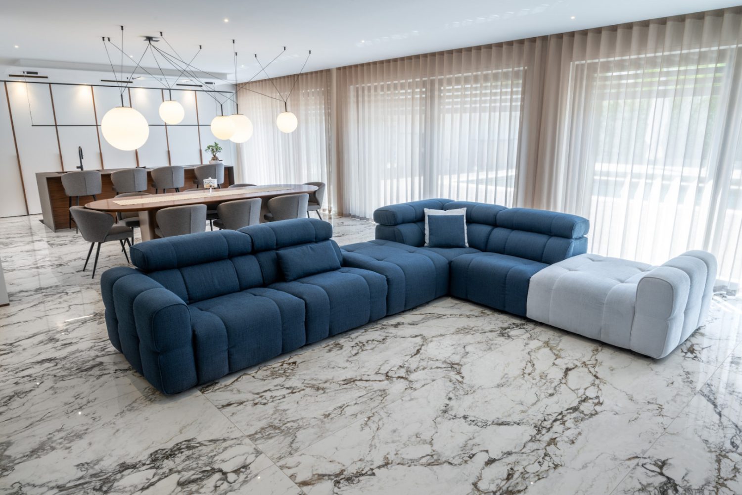 Nell’immagine la nuova reference di Ceramiche Keope, una villa ad Altamura in cui il design contemporaneo si coniuga al tocco retrò dei rivestimenti effetto marmo di Interno 4, serie omaggio ai palazzi nobiliari dell’architettura modernista italiana. La finitura impiegata è Breccia Tortona nel formato 120×178. Le stesse lastre rivestono anche i pavimenti e le pareti della sala da bagno, compresi gli interni della doccia. In sintonia con la calda palette degli interni, la facciata della residenza è rivestita con l’effetto pietra calcarea di Brystone Ivory, nel formato 60×120.