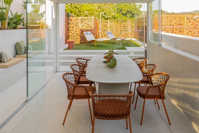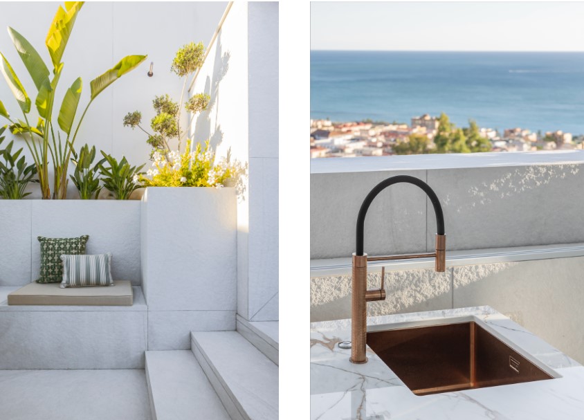 Il terrazzo impreziosito dal design ceramico dell’azienda di Reggio Emilia, dagli arredi ai colori, è un omaggio al Mediterraneo. Per questo motivo, è stata scelta Sublime di Ceramiche Refin, collezione in grès porcellanato ispirata dai profumi e dai colori della Borgogna, area di origine di una particolare pietra di origine calcarea, oggi introvabile, le cui cromie richiamano quelle locali. Una collezione pensata per essere visivamente genuina, per accogliere e trasmettere serenità e armonia.