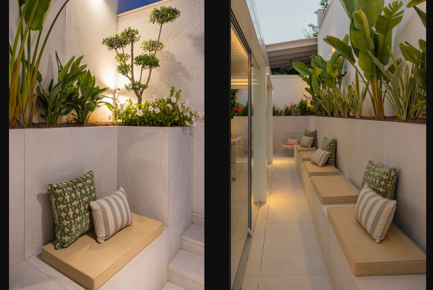 Un dentro e un fuori accomunato dalla scelta delle superfici ceramiche di rivestimento, applicate a terra e a parete, a rivestire la scala di accesso e le sedute/fioriere e il muro di contenimento su cui si attestano. Per questo angolo di Mediterraneo, gli architetti hanno scelto Sublime di Ceramiche Refin, collezione in grès porcellanato ispirata dai profumi e dai colori della Borgogna, area di origine di una particolare pietra di origine calcarea, oggi introvabile, le cui cromie richiamano quelle locali. Una collezione pensata per essere visivamente genuina, per accogliere e trasmettere serenità e armonia. Scelta qui nella tonalità Ivory, la sua superficie si caratterizza per alonature e piccoli dettagli che si stendono su un fondo compatto e uniforme, solcato da venature visibili ma non invadenti, valorizzate attraverso lievi contrasti e passaggi di colore. Il formato120x120 cm, in finitura strutturata, è stato altresì oggetto negli angoli di una lavorazione “a becco”da2cm, operazione su misura svolta direttamente da Ceramiche Refin, che ha supportato i progettisti nel rendere tangibile la loro visione.
