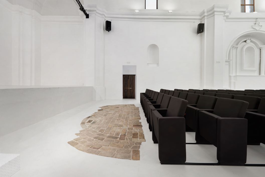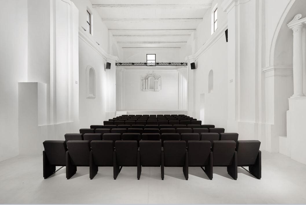 È all’interno che gli architetti hanno avuto modo di operare con maggiore libertà di azione: varcata la soglia lo stile cambia radicalmente, come un salto dal passato al futuro. Uno spazio black and white moderno, in cui attorno ai ranghi serrati delle cento sedute nere, tutte le superfici verticali e orizzontali sono state sbiancate, le loro variazioni materiche e volumetriche semplificate in una sobria sequenza di chiaroscuri. Solo alcuni frammenti riscoperti emergono da questa coltre uniformante: le travi del tavolato di sottotetto, ricostruito in luogo della controsoffittatura modulare di epoca recente, e soprattutto una porzione del pavimento originale, ritrovato grazie al ribassamento completo del piano di calpestio. Unica eccezione cromatica nell’intera navata, il parterre di pietra richiama la materialità perduta del luogo e delimita con la sua presenza uno spazio di rispetto tra gli spettatori e la scena.