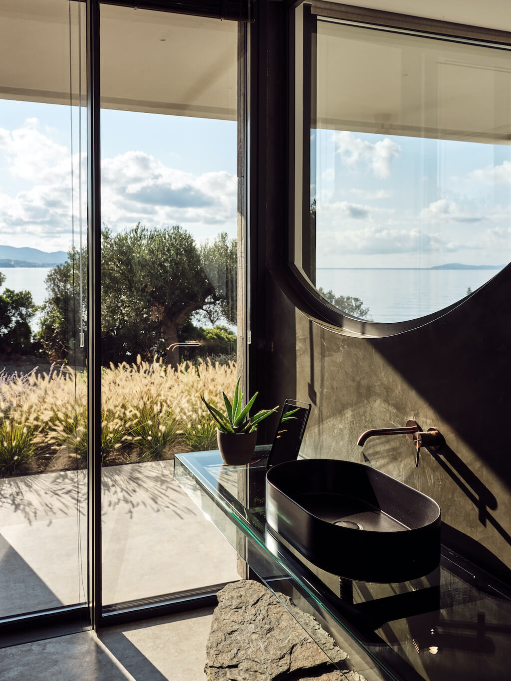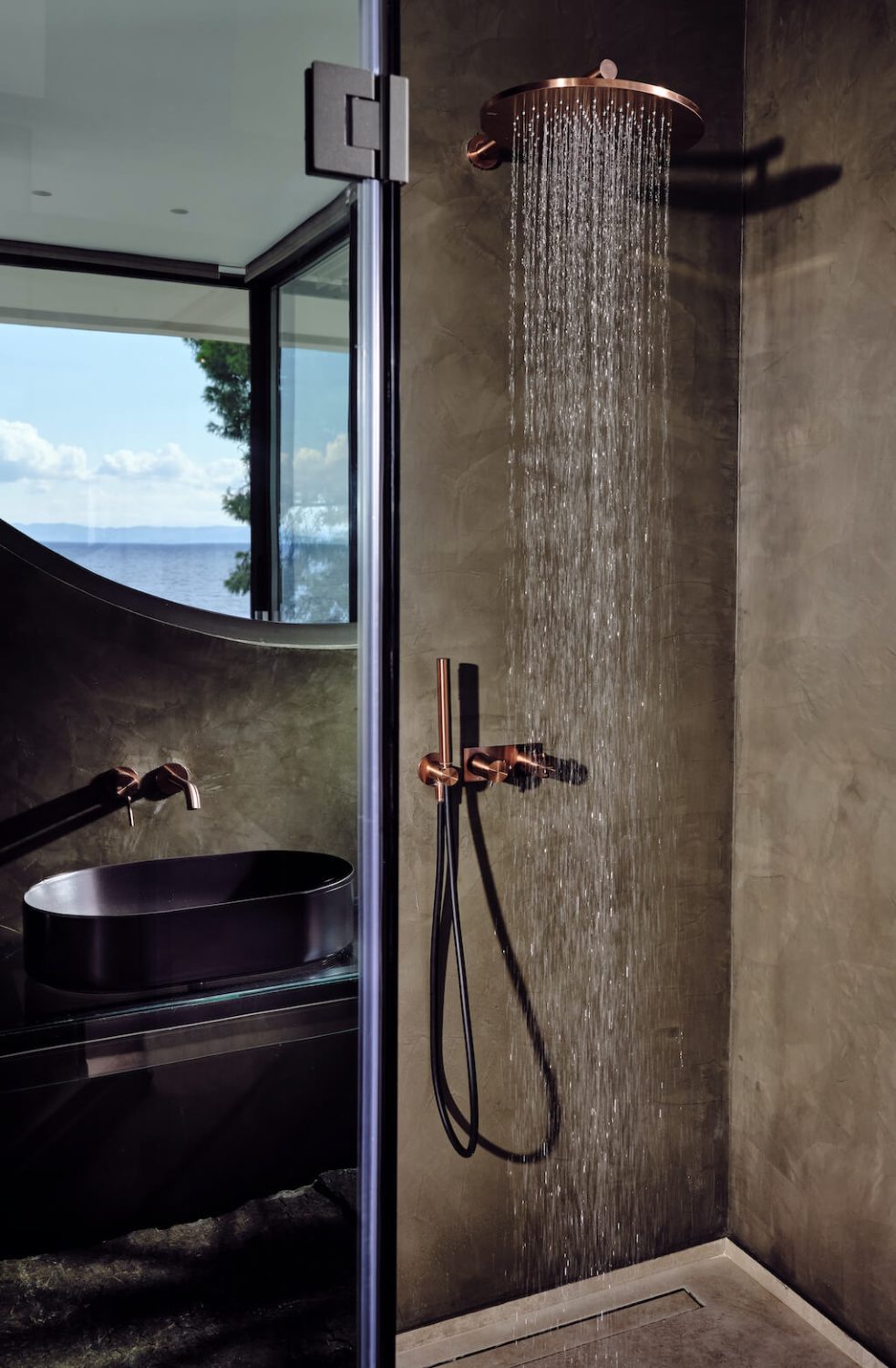 Uno spettacolare scenario dove la vita è meravigliosa e i giorni di vacanza diventano momenti indimenticabili. Le porte a vetri aperte, lunghe 10 metri, consentono entrando di concentrarsi sull’orizzonte e sul Golfo di Toroneos. La vista infinita sul mare e sull’isola di Kelifos è godibile da ogni stanza. Sono gli esterni, con la piscina riscaldata di 120 mq, il giardino sul tetto con una vista mozzafiato a 360 gradi sul mare e sul bosco, l’area lounge esterna con camino e Jacuzzi e la spiaggia l’acqua di un azzurro unico, a creare il contesto ideale per la collezione per esterni Gessi Spotwater: tubolare e girevole, reinterpreta, in chiave architettonica, il look e la funzione del soffione.