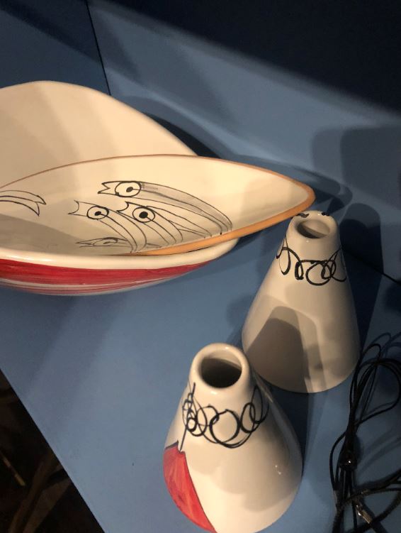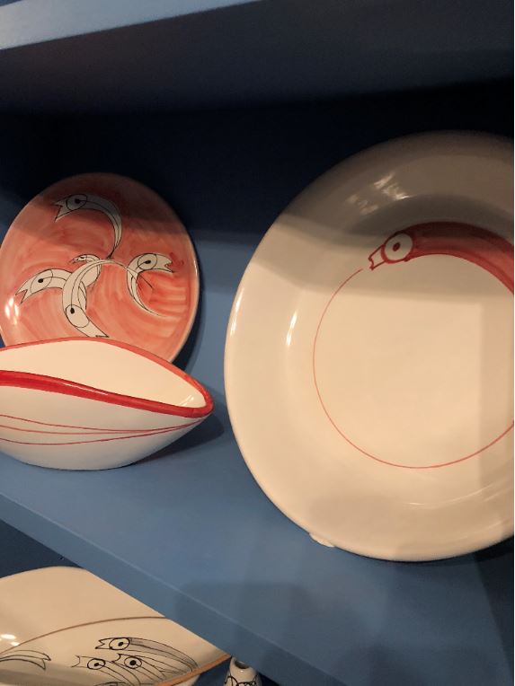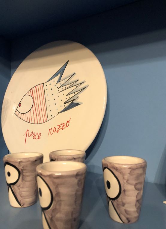 Loredana Salzano, che ha portato già altre volte il suo concept Alice Attònita fuori dalla “casa” delle Eolie, è accomodata con i suoi pregevoli piatti e mise en place di ceramica di Lipari sul lato destro del negozio. La sua forza vulcanica ed espressiva si evice anche dalle poetiche scritte con cui decora i suoi oggetti rifiniti a mano. Attorno, le foto di grande formato e grande impatto di Maurizio Vezzoli, che proprio alle Eolie ha realizzato un grande progetto qualche anno fa.