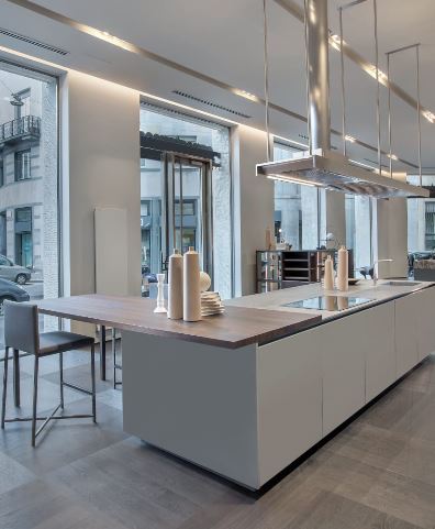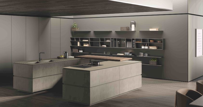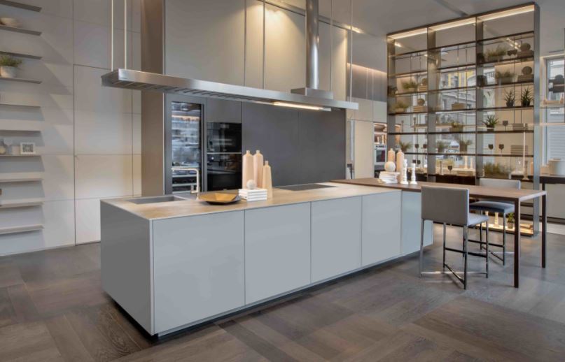 La configurazione di One nello showroom milanese è caratterizzata da un’isola composta da basi in laccato lucido Grigio Vaio, con gole e zoccoli nella stessa finitura, su cui spicca il top realizzato in Stone+ Thunder Grey, finitura naturale.