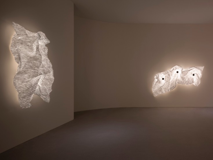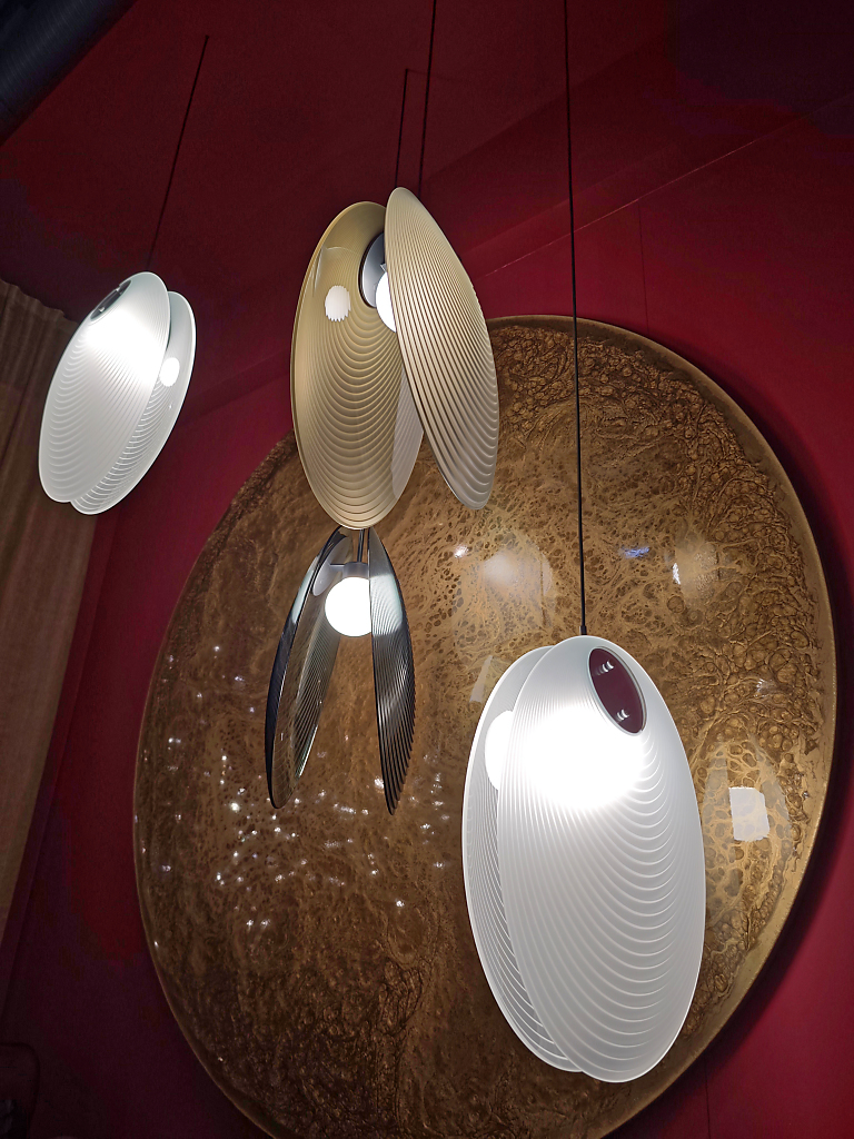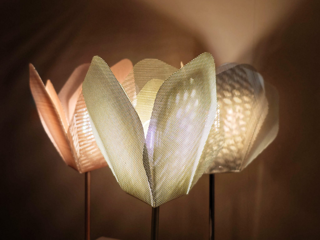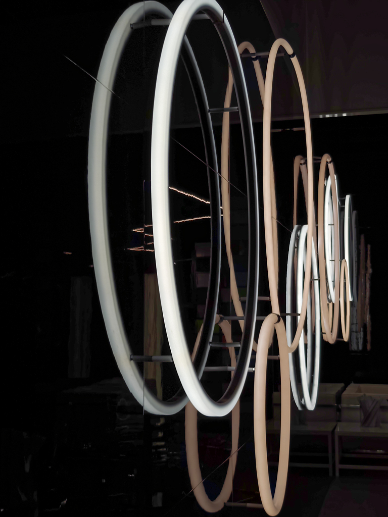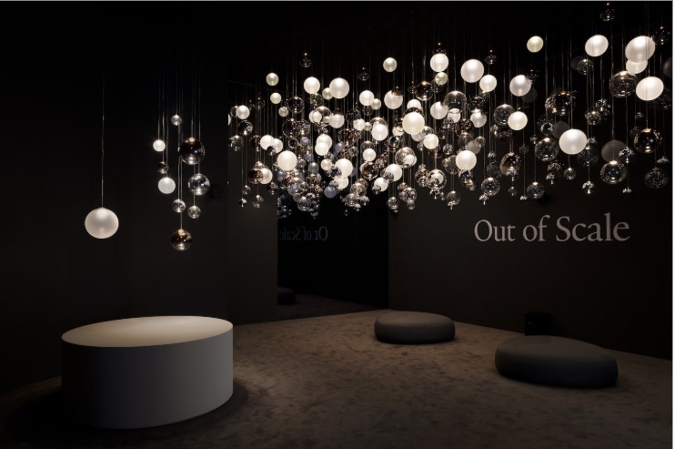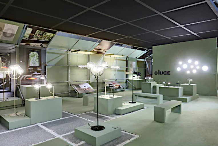 Alcuni video – quelli più astratti e poetici – erano esposti anche all’esterno della superficie dello stand –per invitare i visitatori a entrare e scoprire le nuove lampade di Flos. Queste includono la riedizione della lampada da terra Seki-Han di Tobia Scarpa, un modello molto raro in legno disegnato nel 1963; le sospensioni modulari in vetro Luce Sferica e Luce Cilindrica di Ronan Bouroullec, caratterizzate da leggerezza e poesia; la lampada da parete Maap, di Erwan Bouroullec, realizzata in tyvek e modellabile come un foglio di carta; la famiglia di lampade da terra, da parete e a sospensione in vetro e alluminio Nocturne di Konstantin Grcic, fusione perfetta di artigianalità e tecnologia industriale; l’ironica piantana Jam Session di Piero Lissoni, configurabile in più teste luminose; e infine la suggestiva collezione Linked, di Michael Anastassiades, un sistema modulare in vetro dal carattere poetico ed evocativo. Oltre alla SuperWire di Formafantasma, protagonista anche dell’installazione realizzata ad hoc per lo showroom.