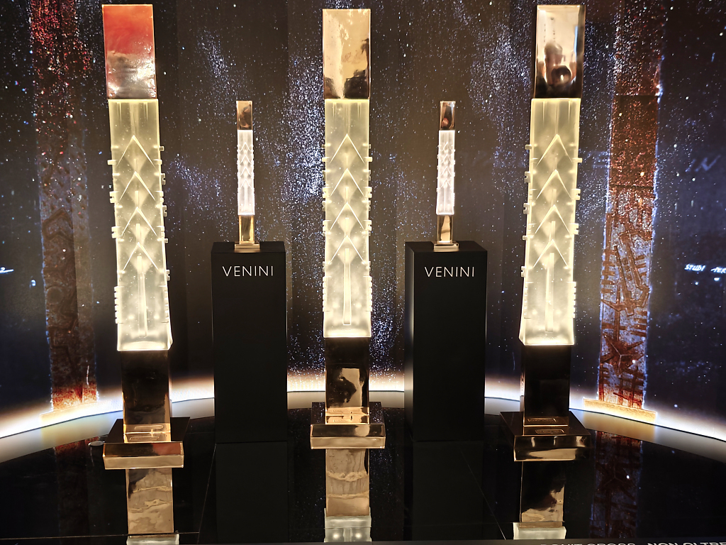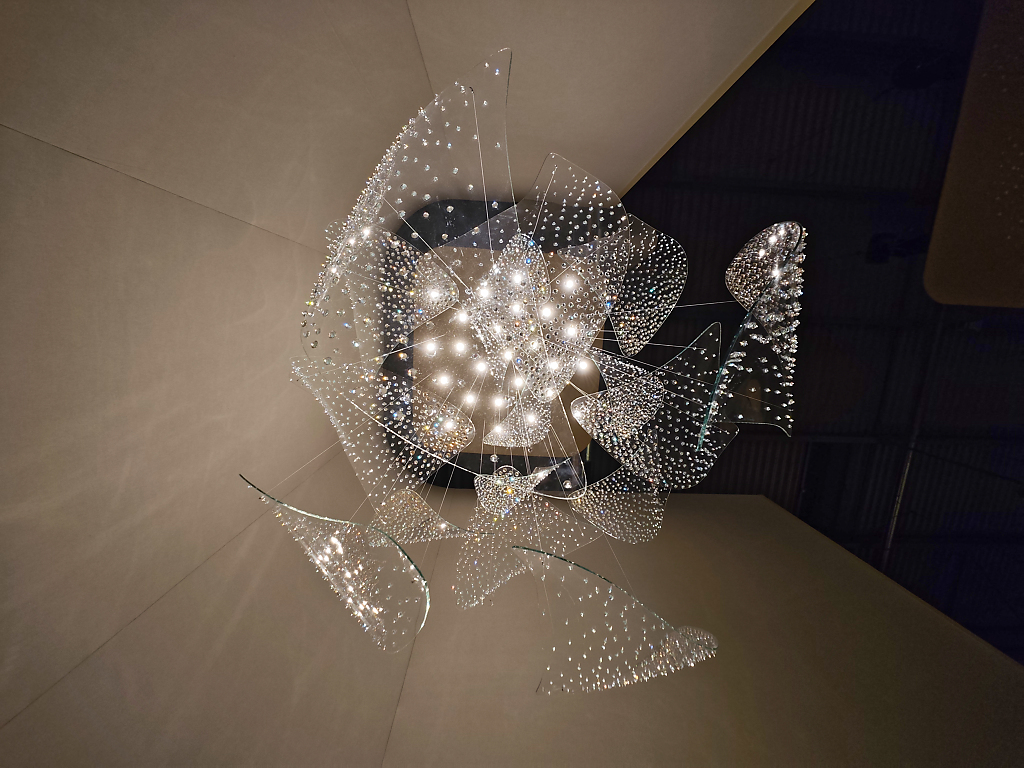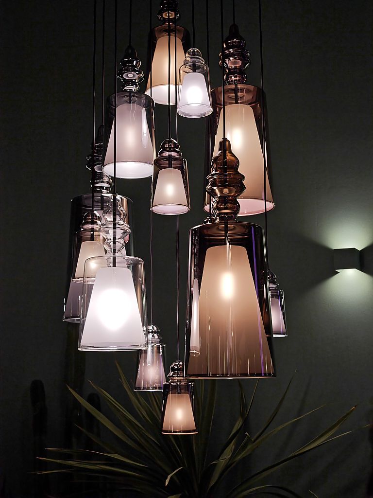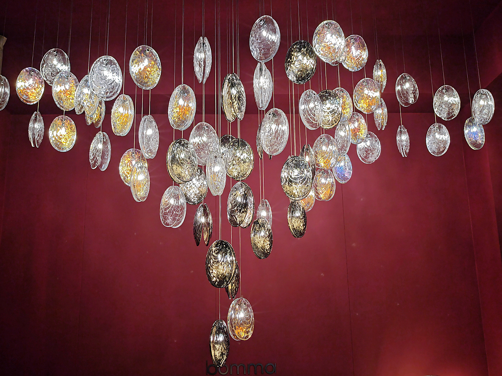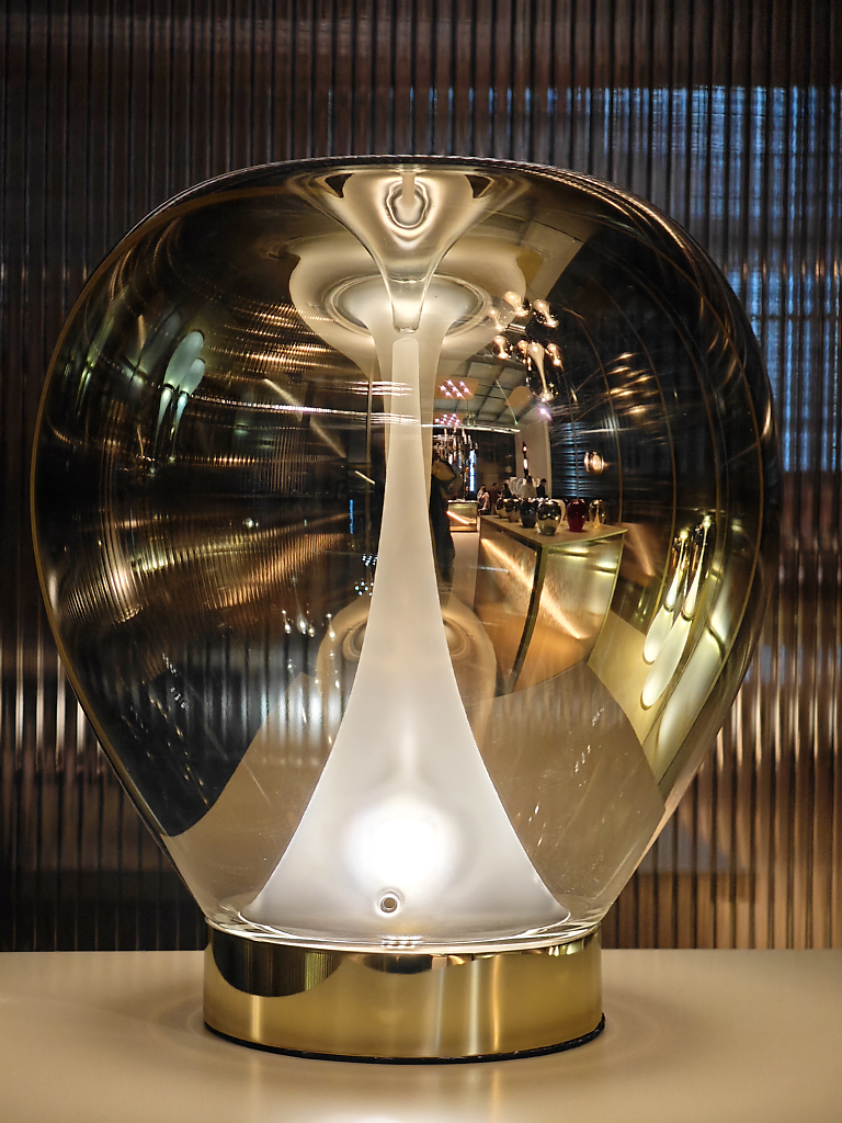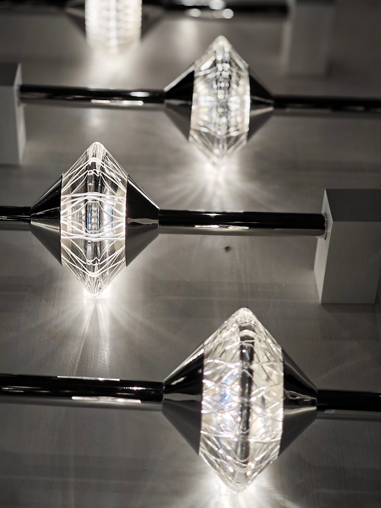 Grazie alla tecnica a “luce iniettata”, la luce attraversa e anima il cristallo, rifrangendosi tra bolle e incisioni, amplificata da una finitura argentata interna che ne esalta profondità e brillantezza.