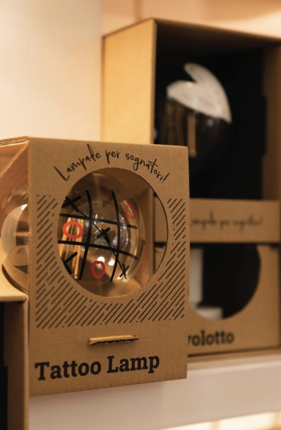 - Lampadine Mood – ilfilotto, questa è invece la linea Tattoo Lamp: lampade Filotto con vetro schermato da scritte o simboli grafici con il doppio obiettivo di aumentare il comfort visivo riducendone o azzerandone l’abbagliamento in modo funny e colorato.
