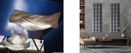 Nella sezione dedicata al design dei materiali e dei sistemi tecnologici è stato selezionato Fuji, design Moreno Ferrari. Il progetto applica ed interpreta la nuova tecnologia acustica Snowsound Leaf, ispirandosi alla natura. Il risultato è un elemento fonoassorbente inedito, che può essere sagomato dall’utente, grazie alla struttura interna in alluminio flessibile, per creare innumerevoli forme diverse, come le foglie del mondo vegetale.