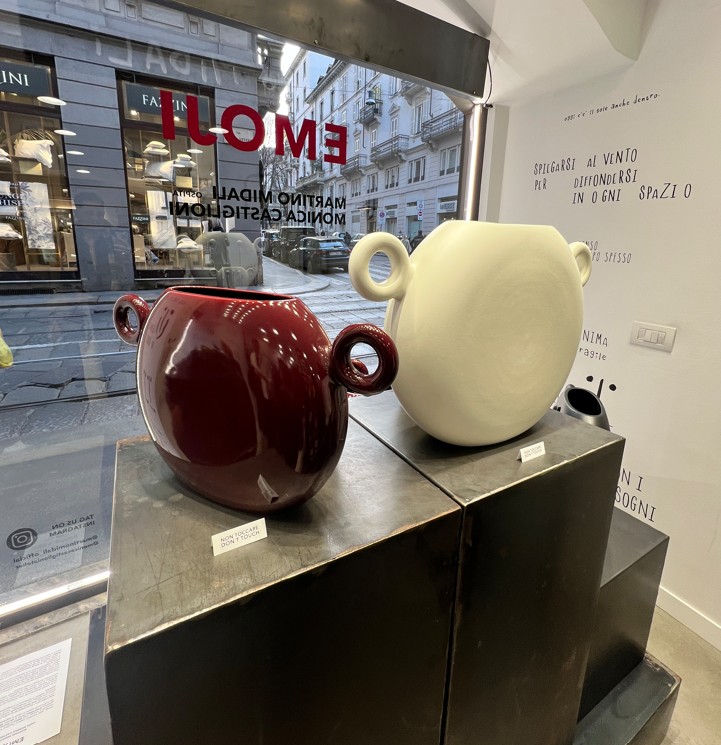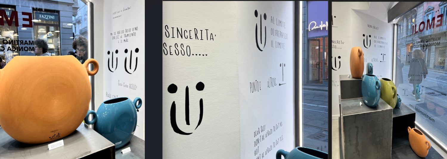 Un dialogo tra forme e sentimenti che trova nella materia il suo trait d’union e che si concretizza, nella vetrina della boutique, in due creazioni in ceramica che reinterpretano l’essenza classica del vaso inteso come custode di emozioni. Lory e Lino sono caratterizzati dalle fattezze delle più classiche emoji – il primo sorridente e gioioso, il secondo più serio e riflessivo – e invitano lo spettatore, con l’essenzialità delle loro espressioni, a una riflessione profonda sulle proprie emozioni, trasformandosi da semplici elementi decorativi a centro di un’esperienza narrativa e sensoriale unica.