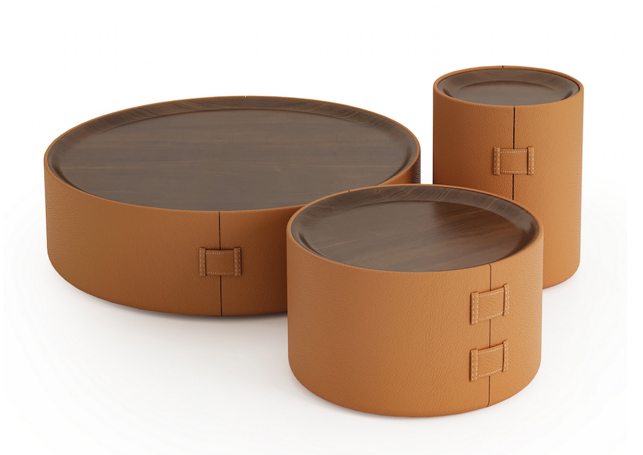 Accompagnando il divano, i coffee table Atelier si presentano come fedeli compagni, offrendo un solido supporto come piano di appoggio. Con una forma cilindrica e disponibili in diverse altezze, i tavolini hanno una struttura rivestita in pelle con l’applicazione di fibbie, che nell’eleganza della pelletteria italiana, riprende gli inserti del divano, mentre le finiture dettagliate richiamano la maestria sartoriale e la precisione degli accessori di alta moda, offrendo al contempo funzionalità e stile.