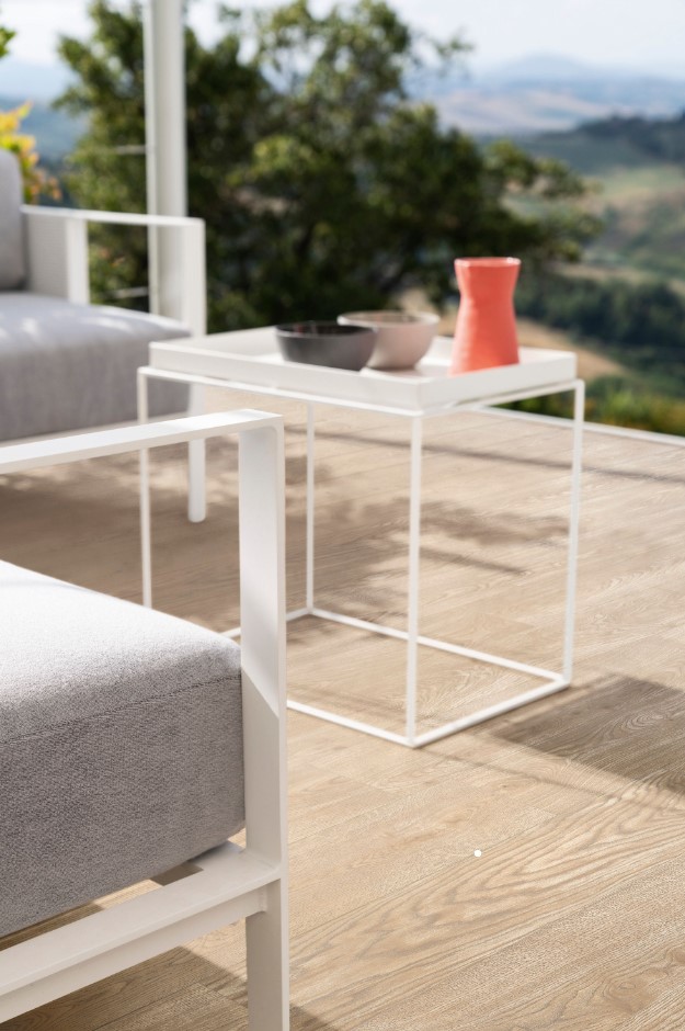 L’elemento principale della collezione è caratterizzato da nodi e spaccature, con una leggera venatura in pietra.