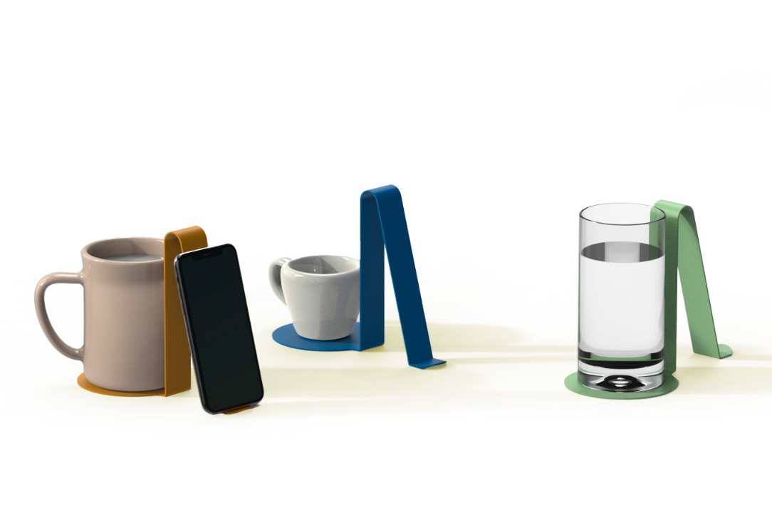 Un sotto tazza per bicchiere, tazzina o mug, la cui base si sviluppa in una ‘V’ rovesciata che serve a sorreggere uno smartphone. Materiale: ferro verniciato a polvere. Variante colore: azzurro grinzato. Dimensioni: cm. 10 (l.) x 19,50 (p.) x 15 (h.). Realizzato a mano, in Italia.
