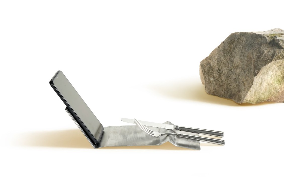 Oltre alla canonica funzione, consente di trovare la giusta posizione a tavola per lo smartphone. Materiale: acciaio AISI 316 satinato con spazzolatura non uniforme.