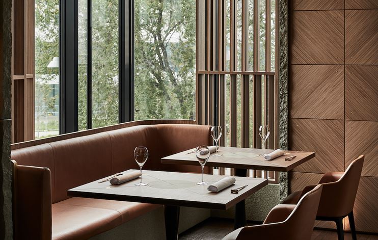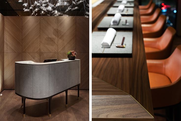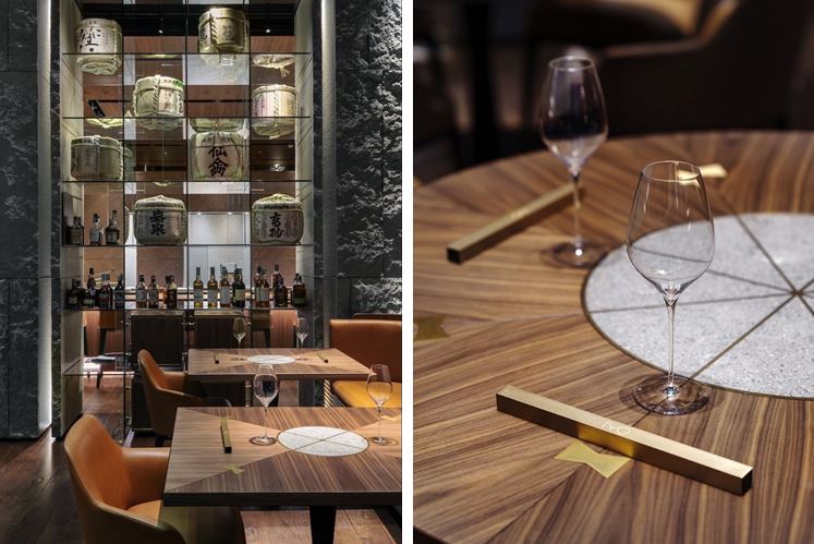 Lo spazio, di 320 mq, si snoda in un percorso che abbraccia la grande cucina a vista, la cantina, l’esclusiva saletta Sushi Banco e il Ristorante Gastronomico. Materiali naturali – legno di noce, porfido, ottone, pelle – si combinano con elementi sofisticati e tecnologici.