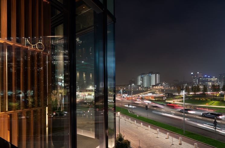 La parete di ingresso è realizzata con Brise Soleil in noce canaletto e lascia intravedere sia l’ambiente interno sia la grande vetrata che affaccia sul Bosco Verticale e la Biblioteca degli Alberi.