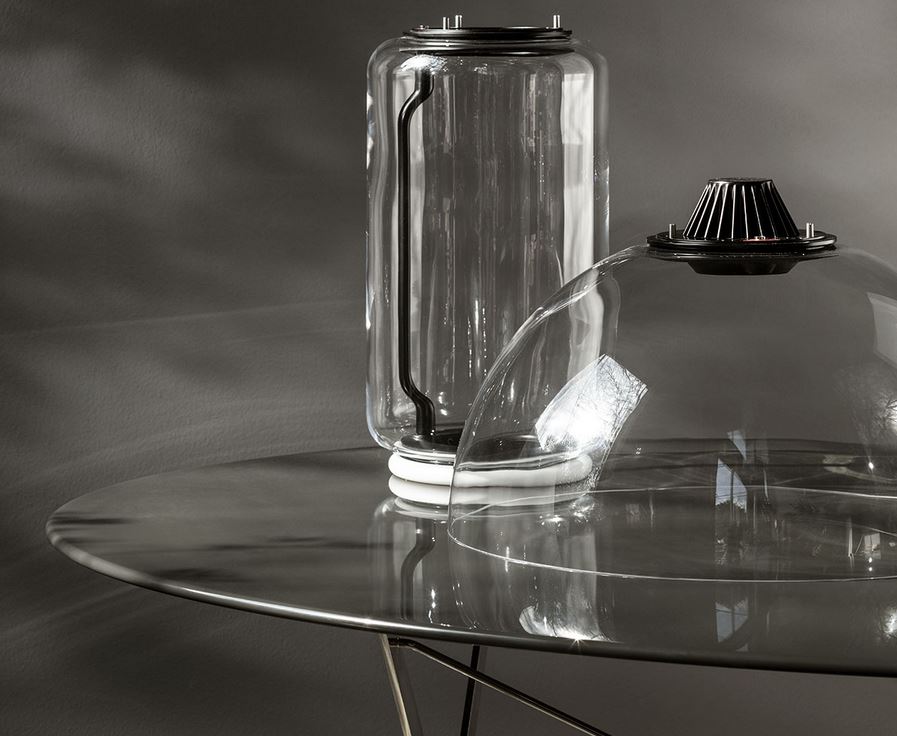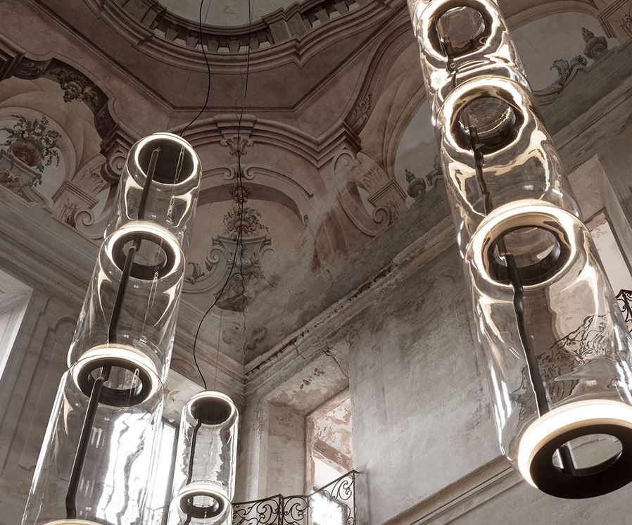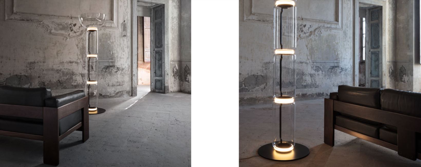 Quasi invisibile di giorno, ma dedito ad affascinanti attività di notte. Un’analogia perfetta. La nuova collezione di lampade è realizzata in moduli di vetro soffiato, trasparenti e dunque quasi inesistenti durante il giorno. Ma se accesi nell’oscurità si trasformano in splendide lampade illuminate. I moduli in vetro a forma cilindrica sono i fondamenti della collezione. Il modulo singolo è una lanterna. Diversi moduli sovrapposti creano una colonna di luce, o un chandelier per il vano delle scale. Altri elementi come la cupola in vetro o la testa a forma di cono consentono ulteriori performance come una piantana e una sospensione.