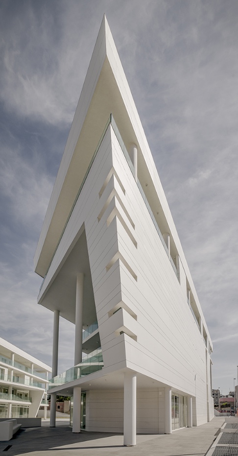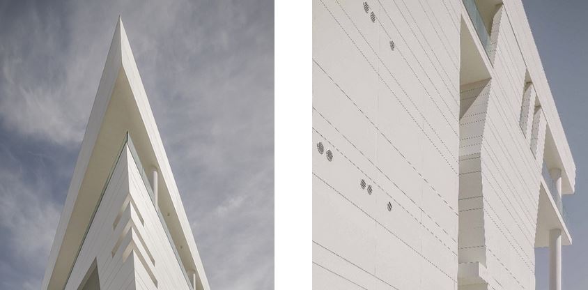 Il design degli esterni è unico ed estremamente originale caratterizzato da ampie vetrate, terrazzi che si affacciano sulla piazza centrale e facciate perfettamente bianche che si uniscono creando una forma appuntita.