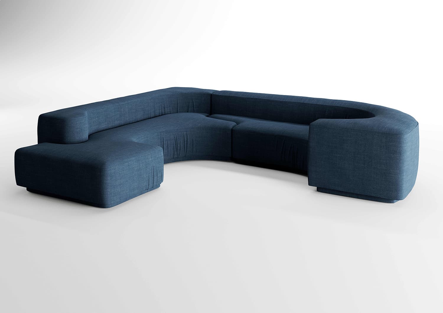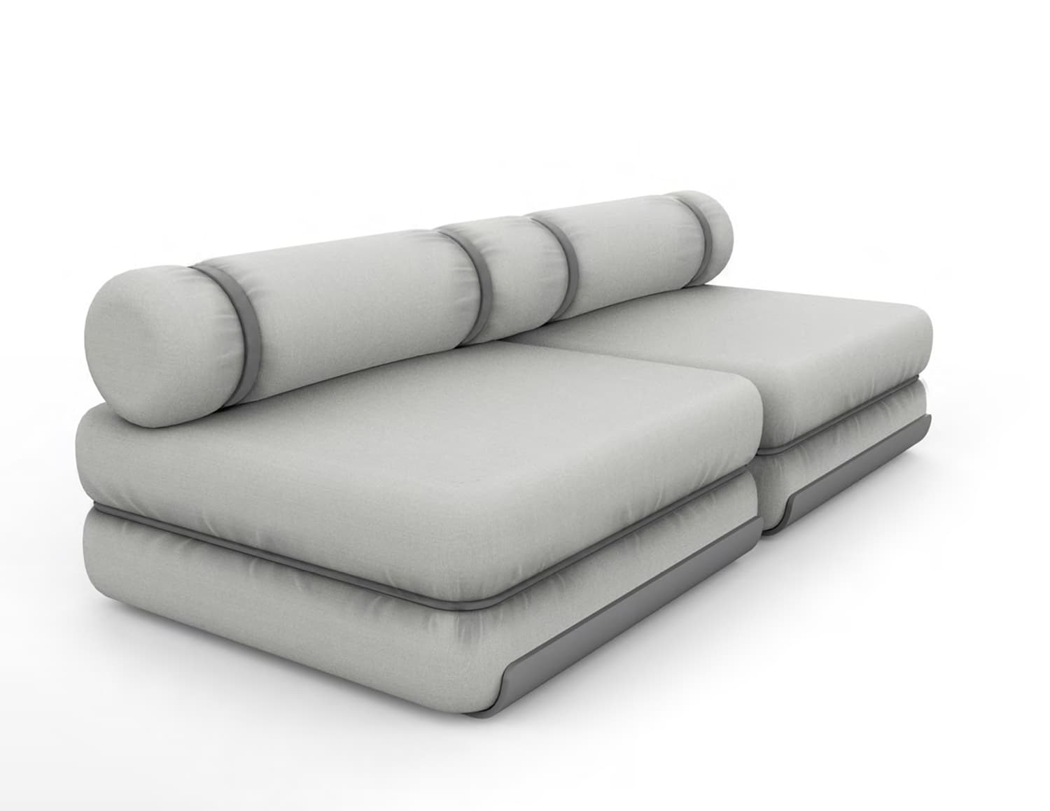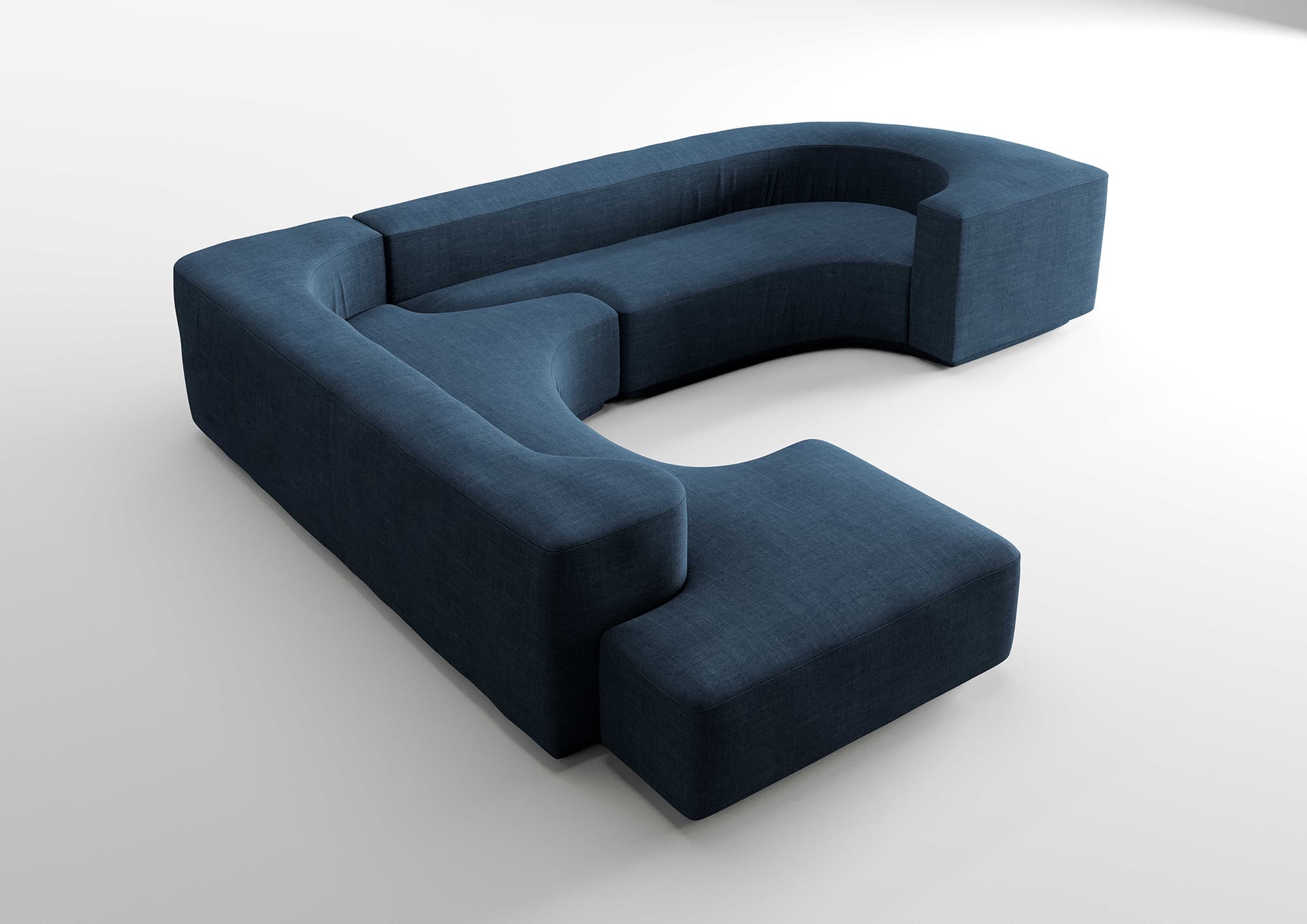 Il divano si compone di due elementi scultorei che si legano tra loro in una rigorosa aggregazione di volumi, con sedute monoblocco scandite da forme curvilinee che ne accentuano la sua decisa personalità.