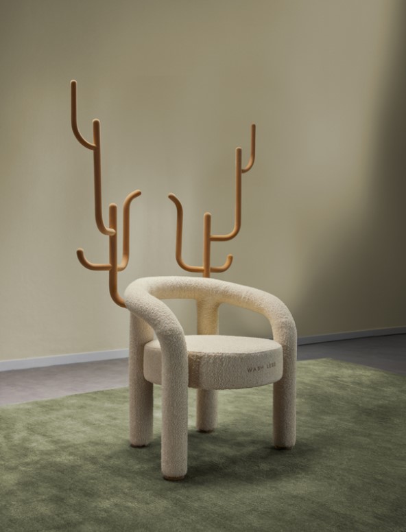 “In italiano, abito e abitare derivano entrambi dal latino habeo, avere”, spiega Fabio Novembre. “Questa profonda connessione linguistica ci invita a riflettere su come il nostro senso del possesso influisca sull’equilibrio del pianeta. Il design è uno strumento per plasmare e definire gli oggetti e scegliere di adornare una comoda seduta con forme che ricordano i palchi di cervo significa adottare il simbolo della rigenerazione di quell’animale. Questo è un promemoria quotidiano della sostenibilità, del nostro rapporto con il mondo naturale e della nostra relazione con i vestiti che indossiamo. ‘Lavare Meno’ diventa un mantra con cui confrontarsi ogni giorno prima di sprecare risorse inutili”.