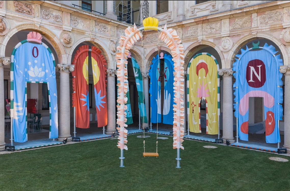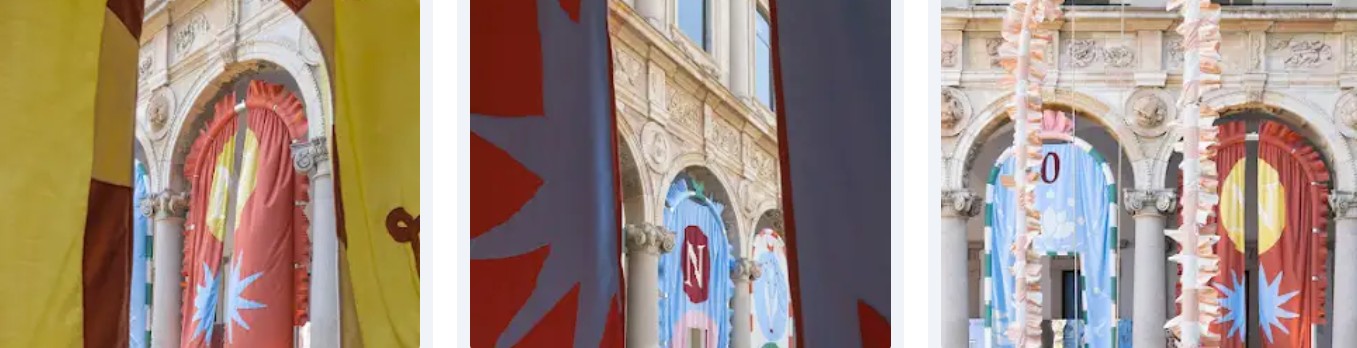 L’installazione è composta da otto imponenti cancelli simbolici ispirati agli archi rinascimentali dell’università, adornati con tessuti fluidi interamente cuciti a mano da Pangea. Questi tessuti fluidi con motivi e fantasie, sospesi all’interno di cornici metalliche, si spostano con il vento e la luce, trasformando lo spazio in un passaggio onirico. Ogni cancello ha un significato più profondo: la mano rappresenta la connessione umana, la pianta simboleggia il mondo vivente, la luna e le stelle evocano il cosmo, il fagiolo incarna la trasformazione e le costellazioni tracciano i legami invisibili che ci uniscono tutti.