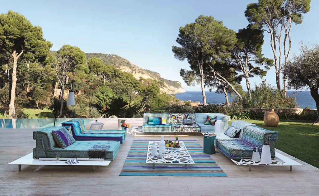 Roche Robois. Mah Jong Outdoor, design Hans Hopfer. E’ un modello icona della collezione Roche Bobois che non smette mai di re-inventarsi. Divano ad elementi rivestito con tessuti concepiti per l’esterno. Sistema componibile all’infinito a partire da cuscini di seduta, schienali dritti o ad angolo ed elementi chaise longue.Tutti i moduli sono trapuntati, con lavorazione a materasso artigianale. Il tavolino in metallo traforato fa parte della stessa serie, il tappeto a righe Valdagno per l’esterno è in tessuto di fibra 100 % poliestere. I colori della composizione sono estivi: a lato e dietro le sedute è possibile appoggiare occhiali da sole, asciugamani e creme solari.