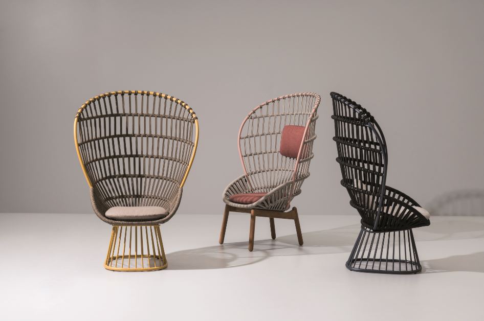 Kettal. Poltrona della collezione Cala, design Doshi Levien il duo indio-britannico. Una seduta maestosa dallo schienale alto, realizzata in alluminio e corda intrecciata lavorata a maglia, materiali che creano un effetto leggero e trasparente. La corda sintetica è disponibile in 17 colori, anche il cuscino posto sullo schienale è disponibili in molti colori. La collezione comprende oltre alle poltrone, divani e pouf. Praticamente un trono moderno. www.kettal.com – rivenditore per l’Italia: www.ecliss.it