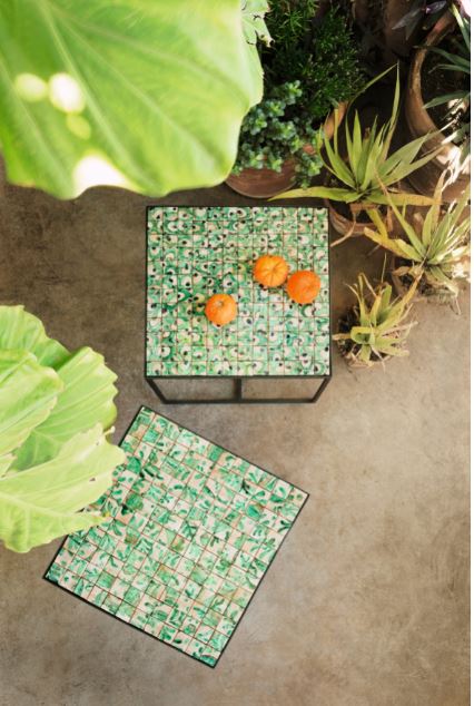 Paola Lenti.Tavolini della collezione Cocci, design Marella Ferrari. Sulla struttura in acciaio inox, un piano composto da elementi in maiolica acquerellata allineati in posizioni predefinite. I piani dei tavolini sono realizzati e decorati a mano con colori esclusivi da Nicolò Morales. Diversi i colori ossidati usati per la decorazione, tutti molto chic. www.paolalenti.it