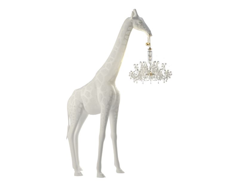 Queeboo. Lampada Giraffe in love outdoor, design Marcantonio. Di dimensione gigante di ben 4 metri in altezza realizzata in vetroresina che sostiene un lampadario classico in stile Maria Teresa. Forma perfetta per creare magiche ambientazioni outdoor, lo chandelier resiste all’acqua e al vento. Esiste anche in versione indoor…per un salone principesco e un filo bizzarro. www.queeboo.com