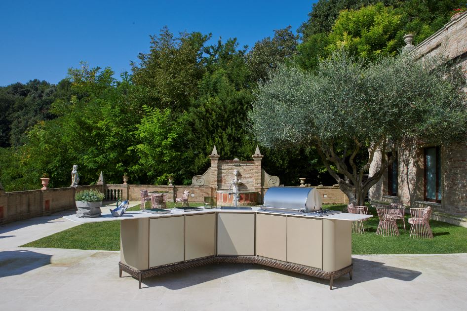 DFN. Curved Kitchen corner composition design Samuele Mazza Outdoor Collection. Una nuova cucina “gioiello” sia dal punto di vista tecnologico che del design. I fianchi sono stondati e la caratterizzano, la base è in resina sintetica intrecciata, la struttura realizzata in ferro è trattata per esterno ha ante rivestite in grès porcellanato con un’esclusiva finitura “metallescente “dorata. Gli elettrodomestici sono dotati di un coperchio per proteggerli quando non vengono utilizzati. Il tutto per un’idea di cucinare all’aria aperta in maniera totalmente nuova. Prodotta e distribuita da DFN srl. www.dfnsrl.com
