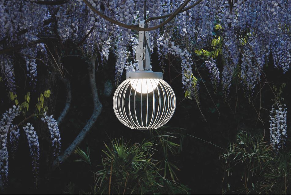 Sovil. Lampada sospensione della linea Cage, da outdoor. Realizzata in alluminio pressofuso, il diffusore è in resina opalina ed è illuminata con 28 LED. L’alluminio pressofuso è un materiale molto leggero resistente alla corrosione ed è quindi ideale per l’ambientazione esterne. Il particolare in cuoio permette di appenderla ad un ramo per illuminare una cena in giardino o terrazzo creando la giusta atmosfera. www.sovil.com
