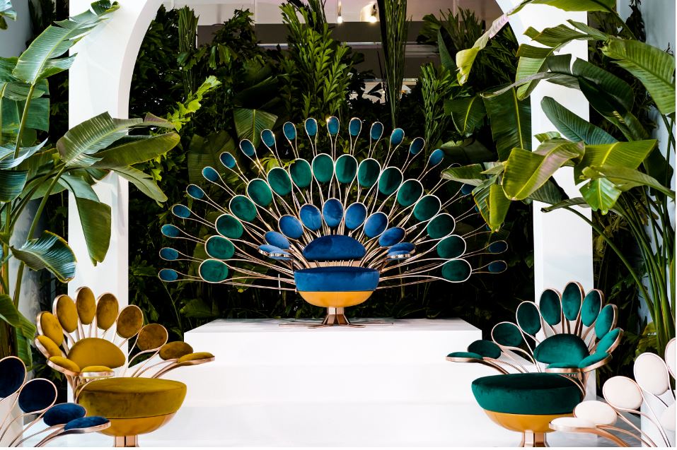 Visionnaire. Poltrona Pavone, Art Design Collection 2020 design Marc Ange. Pavone è un trono, un pezzo unico. Una seduta cerimoniale realizzata con tessuti esclusivi dell’azienda: il verde, blu brillante accompagnati dall’ottone con finitura bronzo. Da usare da sola o in più elementi per creare una scenografia all’insegna del lusso e della bellezza ed ed molto adatta a location cinematografiche. www.visionnaire-home.com
