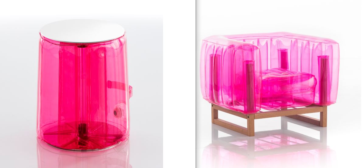 14) Mojow. Collezione Yomi, design Olivier Santini. L’audacia è nell’aria ! E’ il titolo del catalogo dell’azienda francese, da poco rappresentata da una società giovane e dinamica di Cesena. Quando il prodotto verrà consegnato a casa: arriveranno due scatole. Nella prima ci sarà la seduta in PVC gonfiabile semplicemente con la pompa ad aria, quando sarà pronta la si potrà infilare sulla base in legno o alluminio che sarà contenuta nella seconda scatola. Presto il gonfiabile sarà in TPU, materiale Eco-Responsabile, privo di cloro e inodore. Molti sono i colori disponibili per la parte gonfiabile : trasparente, verde cristallo, nero, arancio, rosa e blu. Divani, poltrone, pouf e una lampada, insomma una serie completa da usare dentro casa, fuori, seduti, sdraiati, tutto è permesso al nuovo nomadismo molto pop. www.mojow.it