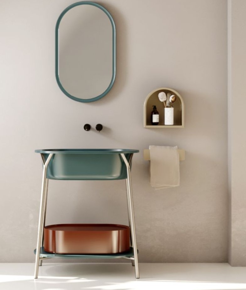 Rift, il sistema bagno progettato da Zetae Studio per Relax Design, si distingue per il design funzionale con un telaio in metallo e un lavabo in Luxolid solid-surface con contenitore. La struttura tubolare in acciaio, tagliata a Y per incastonare il lavabo, offre robustezza strutturale e leggerezza estetica. Il contenitore inferiore in legno laccato fornisce ampio spazio per gli accessori da bagno, semplificando ordine e pulizia. Disponibile in diverse combinazioni cromatiche, sia lucide che opache, si adatta a vari stili di arredo, rendendolo ideale per contesti sia residenziali che contract.