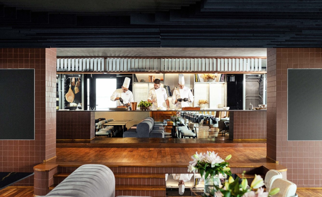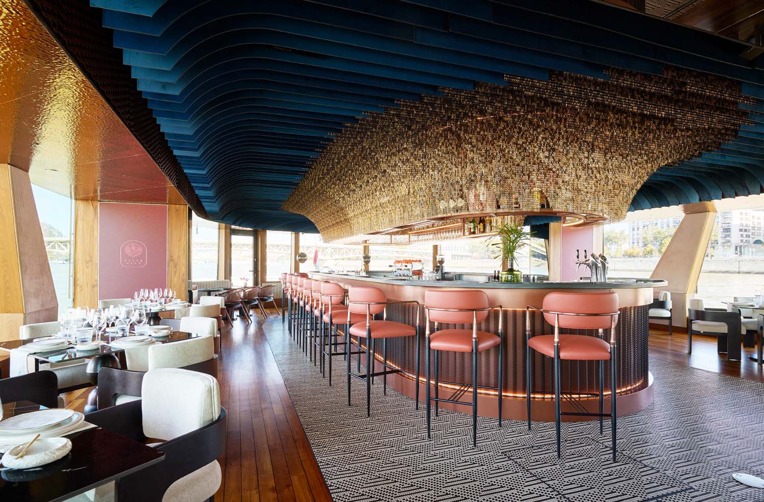 Guidato da Eszter Radnóczy intervistata da The Way Magazine due anni fa qui, d’estate, la regina è la terrazza, con mobili in metallo che riflettono l’incessante fluire del Danubio. Per rendere la nave identificabile da lontano e per offrire un’esperienza non solo ai suoi passeggeri, ma anche a coloro che guardano dai ponti di Budapest, il ponte della nave è ricoperto da un motivo pepita di colore marrone e crema come un tappeto gigante. È un elemento suggestivo e d’atmosfera.