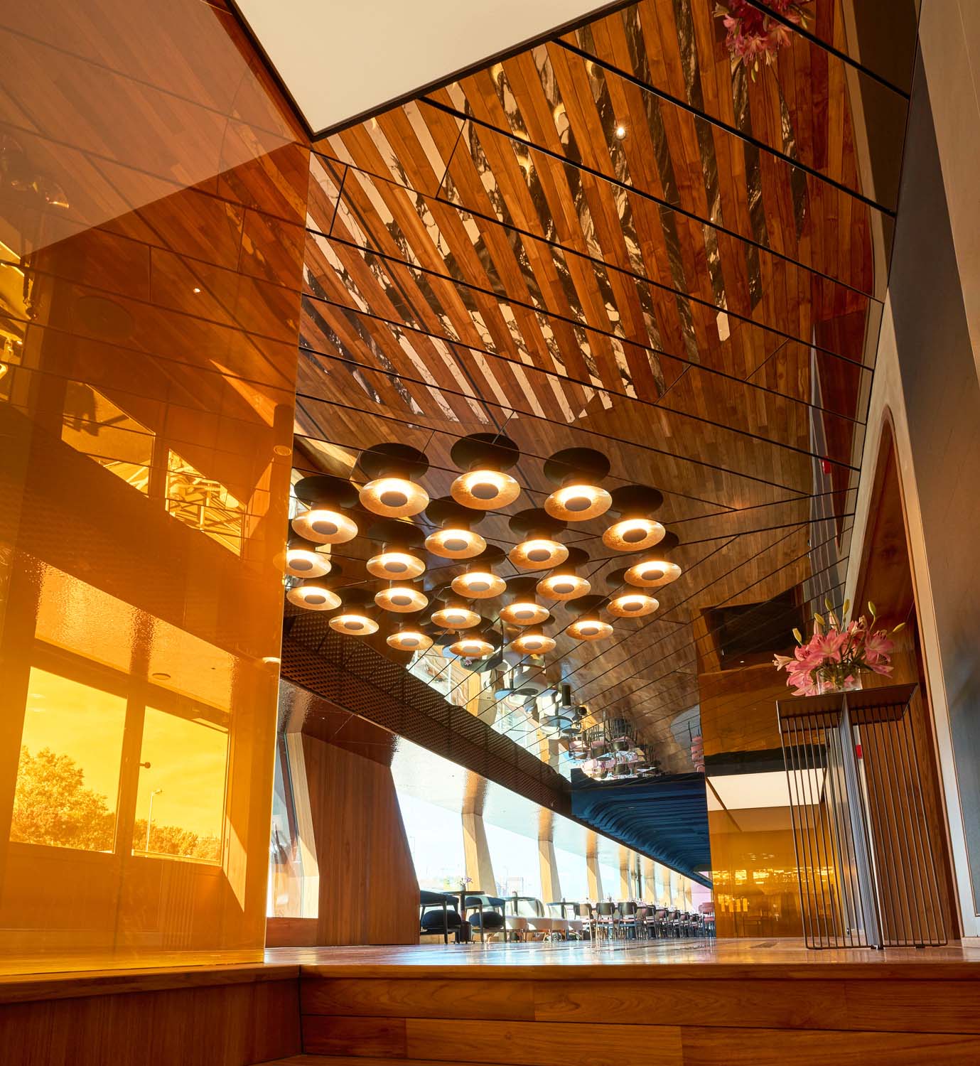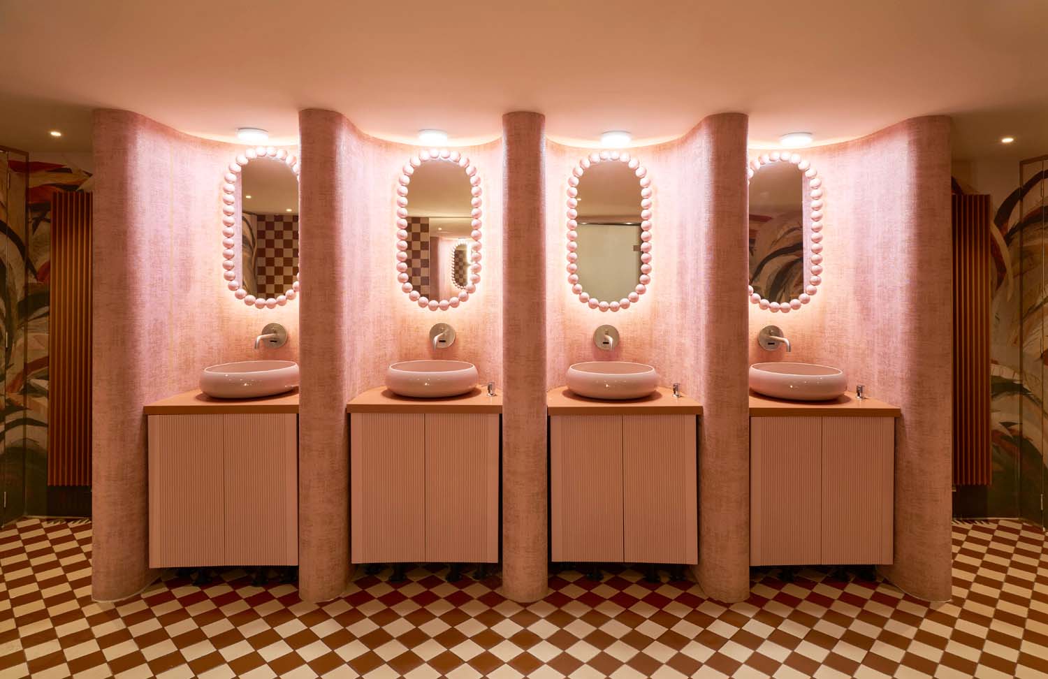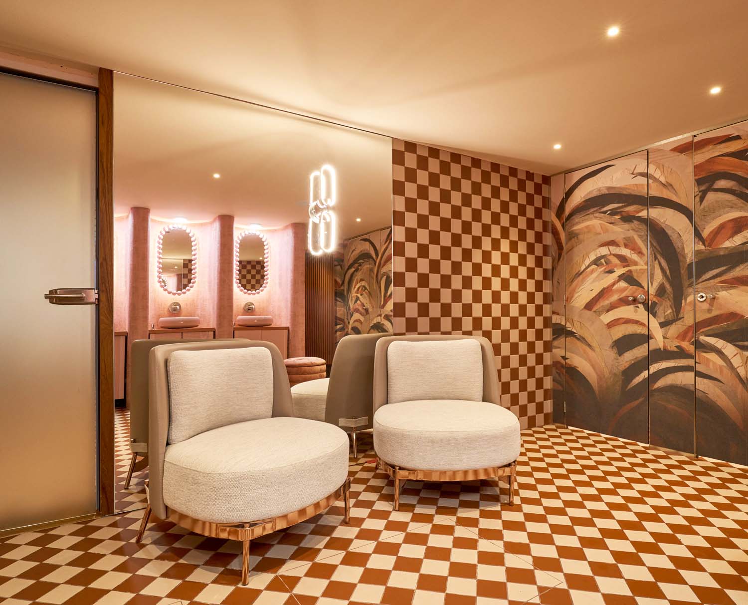 Il prima e il dopo del progetto di interior design rappresentano estremi di un viaggio attraverso stili sostanzialmente contrastanti. Prima del restyling, infatti, imperava un mood anni ’90, pelle rossa, specchi, luci psichedeliche. Oggi, dopo sostanziali modifiche, lo spazio è una celebrazione di curve, riflessi e forme naturali: tonalità terracotta e blu evocano terra e acqua, mentre pannelli tessili fluenti e lamiere catturano il flusso del fiume, rafforzando il legame con l’ambiente circostante.