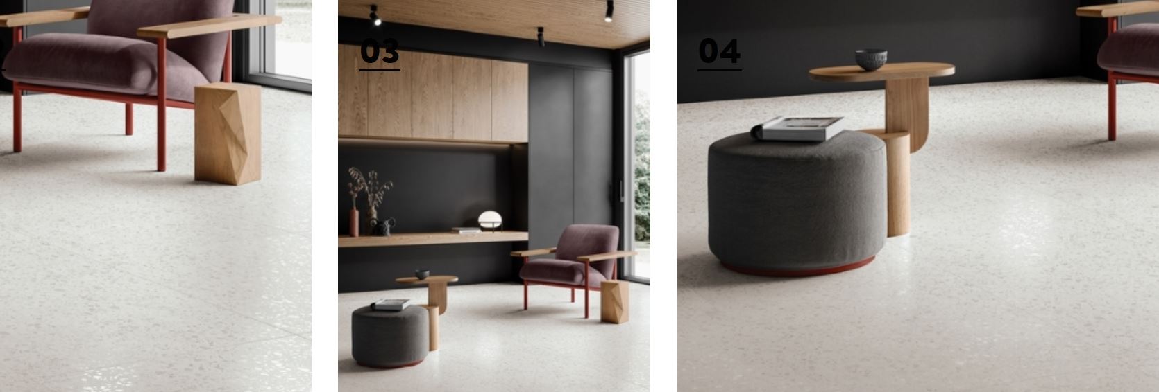 Di grande versatilità, adatto ad ambienti residenziali, ma anche al terziario , ad ambienti pubblici e commerciali, Terrazzo è disponibile nei formati 60×60, 30×60, 30×30, 37.5×75.5 e 75.5×75. 5 cm. nelle colorazioni White, Beige, Black, Pearl e Grey e grazie alle finiture naturale o lucida instaura un dialogo con la luce che esalta gli effetti apparentemente casuali della graniglia e la sua concentrazione o rarefazione in determinate aree del pavimento.