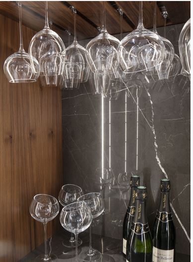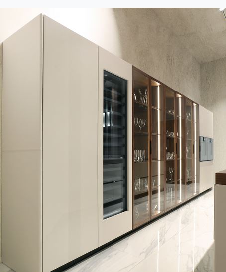Il forno è Gaggenau Vario serie 400 conporta in acciaio inox e vetro pieno. Utilizza metodi di riscaldamento del sistema pirolitico 17, con sonda interna di rilevamento temperatura. Il fascino della cucina V888 è ulteriormente implementato dal versatile mobile dispensa e bar che funge sia da elemento contenitivo che di supporto all’accoglienza. Presenta infatti una struttura in noce canaletto con due ampi e capienti cassettoni, un piano lavoro interno in marmo Pulpis perfetto per svolgere ogni tipo di attività di bar e una funzionale griglia porta bicchieri.